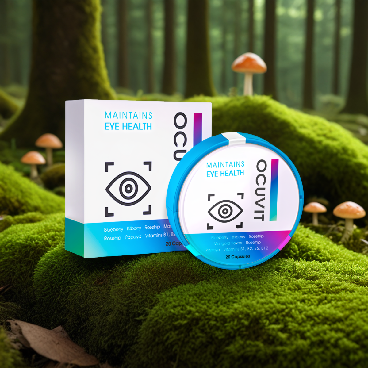 Složení: vitamin C, kyselina hyaluronová, extrakty: borůvka, květ měsíčku lékařského, šípek, černý rybíz; vitamin E, niacin, stearan hořečnatý (objemové činidlo), extrakt z papáji, oxid křemičitý (protispékavá látka), vitaminy: B2, B6, B1, A, D, B12, kyselina listová.